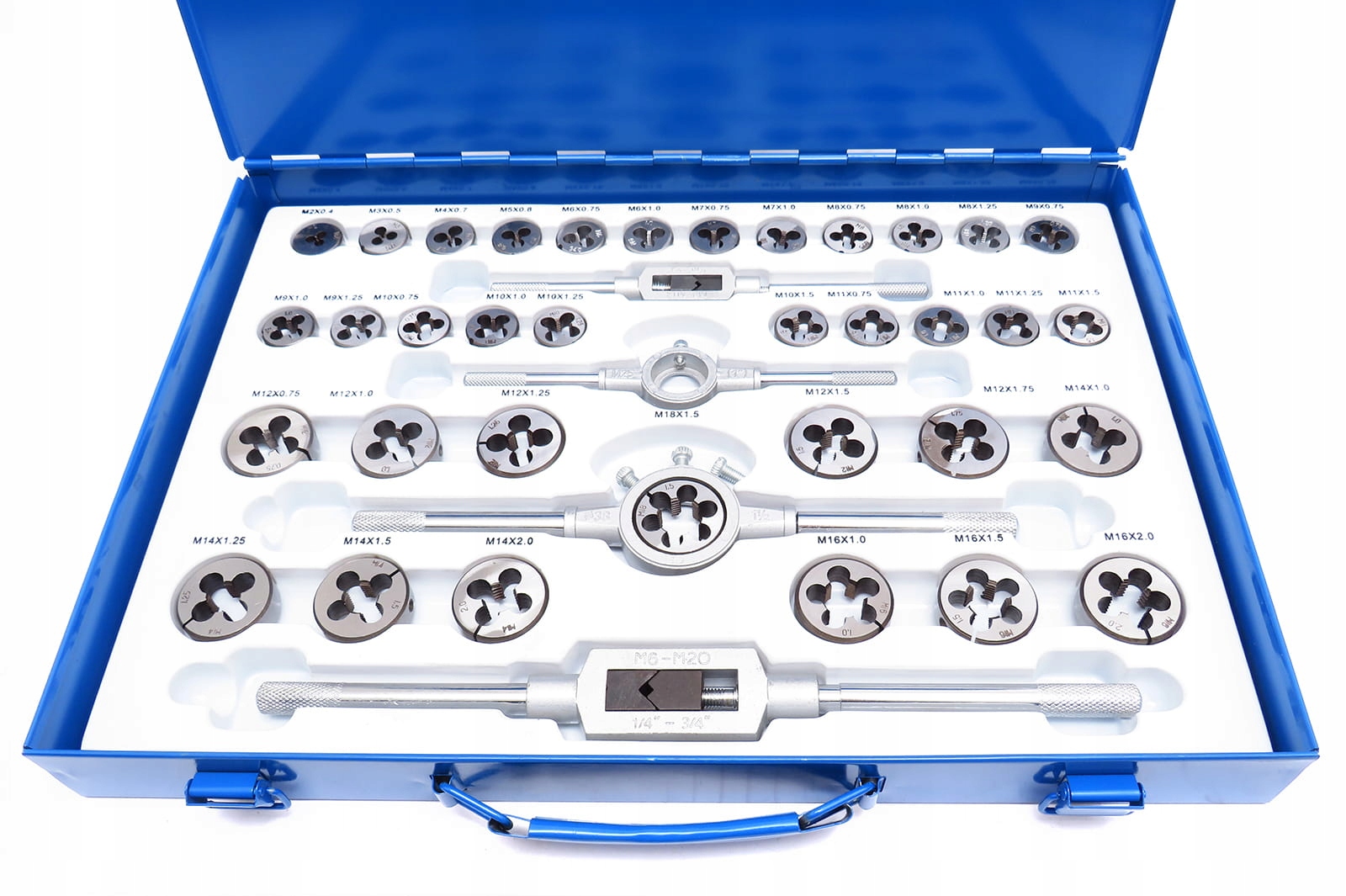 - Мітчики і плашки в практичному кейсі з підписаними розмірами під кожним інструментом. Це полегшує їх зберігання та утримання інструментів у порядку.