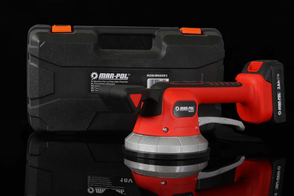 Присоска MAR-POL живиться від літієвої батареї 16,8 В і може використовуватися для внутрішньої та зовнішньої установки. Він замінює традиційну ручну роботу та допомагає уникнути проблем через неправильне розподілення клею під плиткою та великими плитами.
